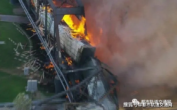 从画面中可以看到,大桥的一部分已经倒塌,大火和浓烟几乎蔓延到整座桥,深灰色的浓烟弥漫在空气中,遮住了太阳,现场犹如一场“灾难”。