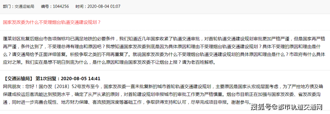 网民朋友:您好!国办发〔2018〕52号发布至今,国家发改委一直未批复新的城市首轮轨道交通建设规划,主要原因是国家从宏观层面考虑,为了严控地方债及确保建成投运后客流能达到预测水平,确定了从严从紧的原则,对首轮建设规划申报城市的审批工作更为严格慎重。烟台市目前正在加强与国家发改委、省发改委沟通,同时进一步完善合规性、地方财力保障、客流预测深度等基础工作,争取获得支持和认可,尽早完成项目申报。谢谢参与。