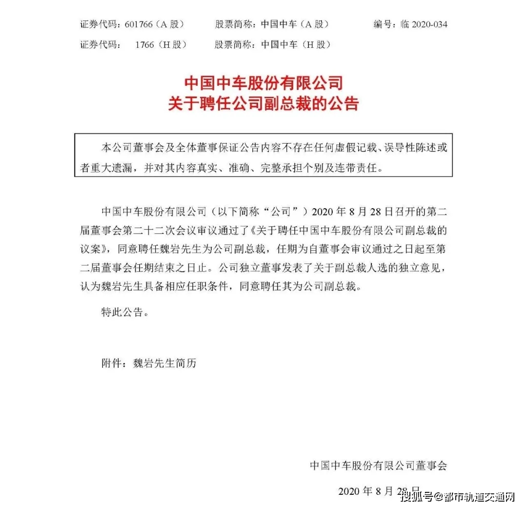 中国中车股份有限公司(以下简称“公司”)2020 年 8 月 28 日召开的第二届董事会第二十二次会议审议通过了《关于聘任中国中车股份有限公司副总裁的议案》,同意聘任魏岩先生为公司副总裁,任期为自董事会审议通过之日起至第二届董事会任期结束之日止。公司独立董事发表了关于副总裁人选的独立意见,认为魏岩先生具备相应任职条件,同意聘任其为公司副总裁。