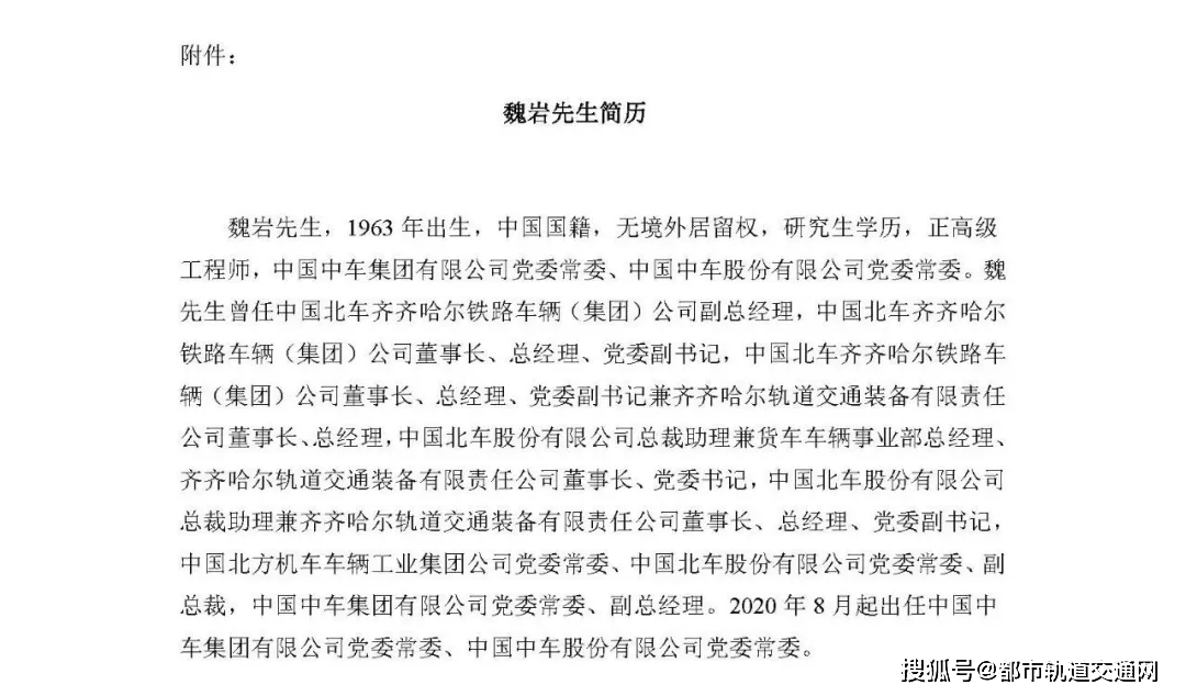 魏岩先生,1963 年出生,中国国籍,无境外居留权,研究生学历,正高级工程师,中国中车集团有限公司党委常委、中国中车股份有限公司党委常委。魏先生曾任中国北车齐齐哈尔铁路车辆(集团)公司副总经理,中国北车齐齐哈尔铁路车辆(集团)公司董事长、总经理、党委副书记,中国北车齐齐哈尔铁路车辆(集团)公司董事长、总经理、党委副书记兼齐齐哈尔轨道交通装备有限责任公司董事长、总经理,中国北车股份有限公司总裁助理兼货车车辆事业部总经理、齐齐哈尔轨道交通装备有限责任公司董事长、党委书记,中国北车股份有限公司总裁助理兼齐齐哈尔轨道交通装备有限责任公司董事长、总经理、党委副书记,中国北方机车车辆工业集团公司党委常委、中国北车股份有限公司党委常委、副总裁,中国中车集团有限公司党委常委、副总经理。2020 年 8 月起出任中国中车集团有限公司党委常委、中国中车股份有限公司党委常委。