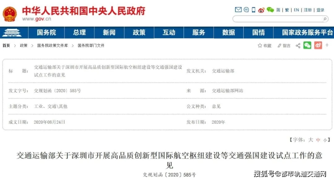 交通运输部关于深圳市开展高品质创新型国际航空枢纽建设等交通强国建设试点工作的意见