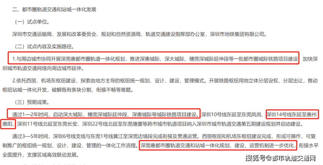 1.与周边城市协同开展深莞惠都市圈轨道一体化规划,推进深惠城际、深大城际、穗莞深城际延伸段等一批都市圈城际铁路项目建设,加快深圳城市轨道交通网络向周边城市延伸。