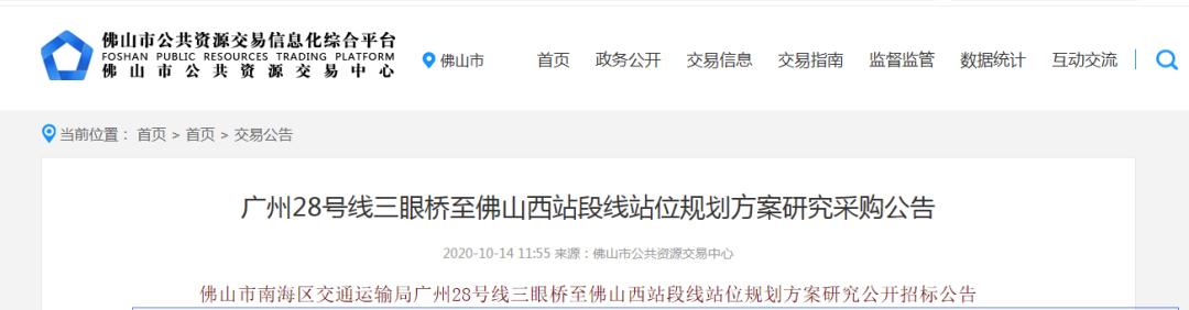 佛山市公共资源交易中心近日发布《广州28号线三眼桥至佛山西站段线站位规划方案研究公开招标公告》(以下简称:招标公告)已发布。