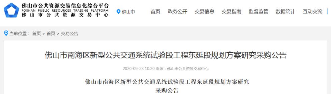 佛山南海区新型公共交通系统试验段工程东延段规划方案研究近日对外招标采购。