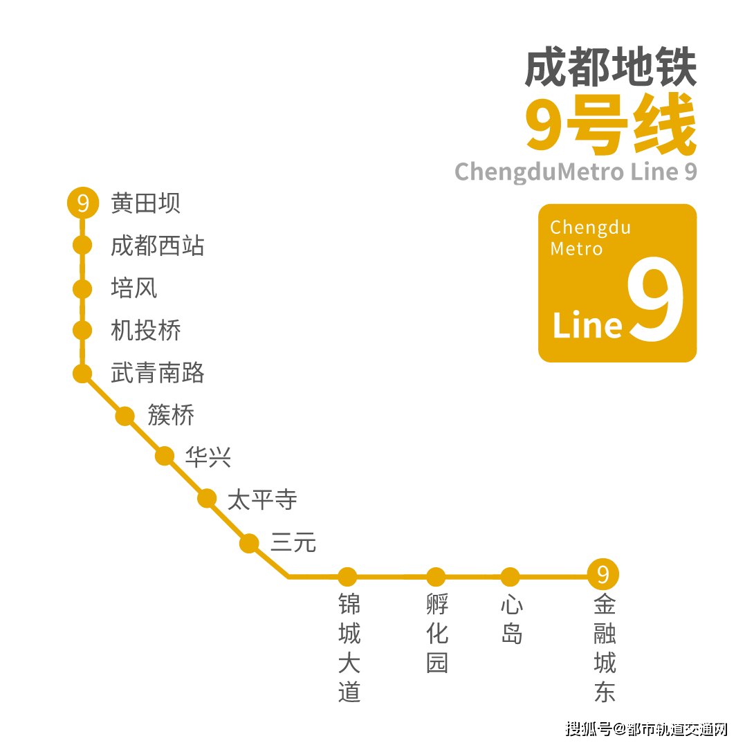 成都轨道交通9号线一期工程线路南起锦江区金融城东站,西至青羊区黄田坝站,沿线途经锦江区、高新区、武侯区、青羊区,均为地下线路。线路全长22.18km,共设地下车站13座,分别为金融城东、心岛、孵化园、锦城大道、三元、太平寺、华兴、簇桥、武青南路、机投桥、培风、成都西站、黄田坝站。其中,与运营线路和在建线路换乘站共9座。另设车辆段1座,停车场1座。