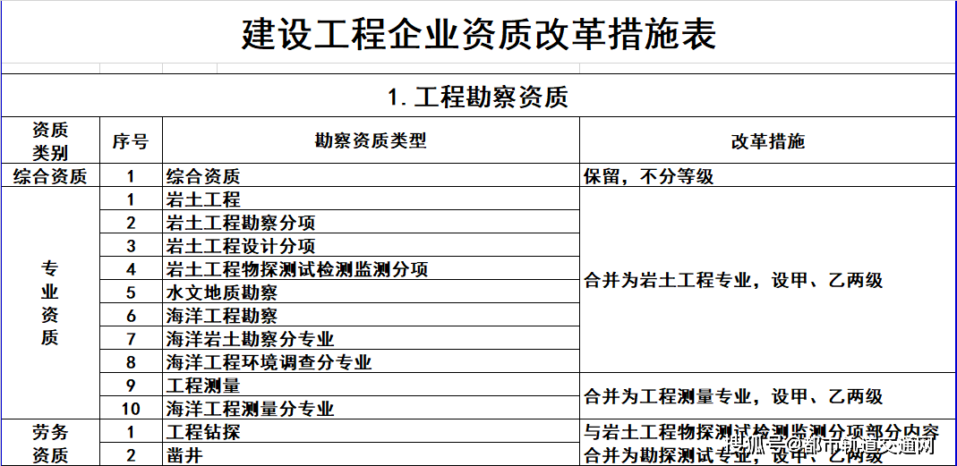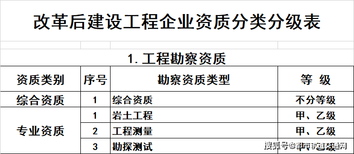 1.工程勘察资质。保留综合资质;将4类专业资质及劳务资质整合为岩土工程、工程测量、勘探测试等3类专业资质。综合资质不分等级,专业资质等级压减为甲、乙两级。
