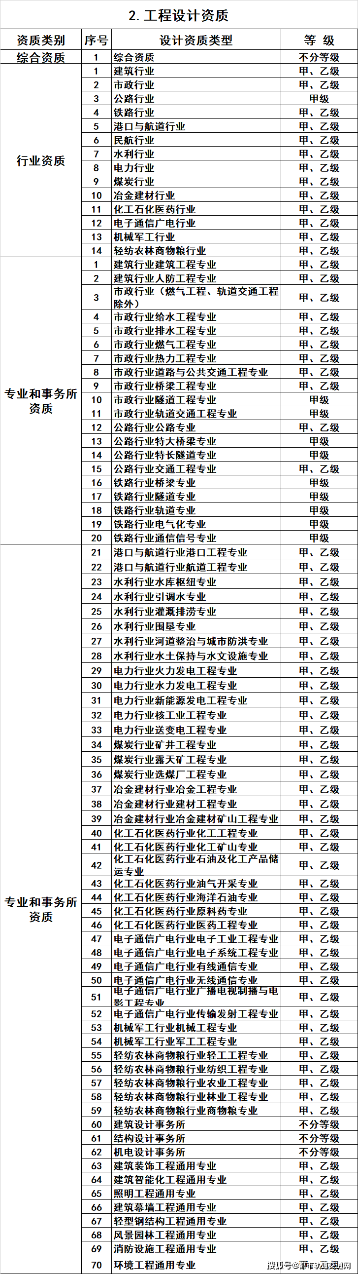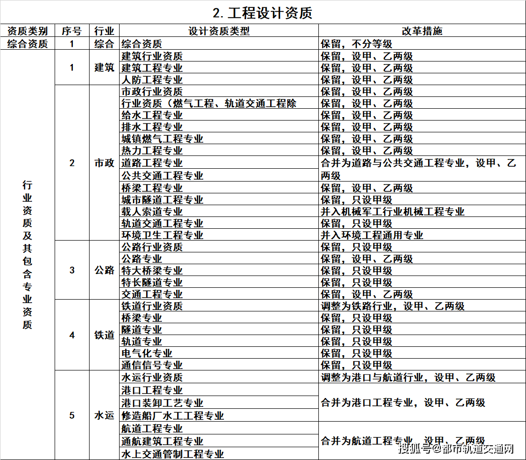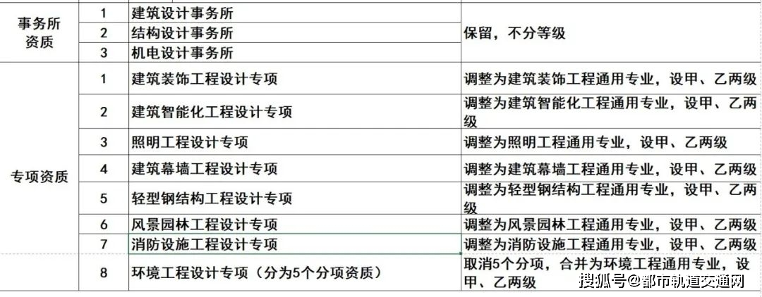 2.工程设计资质。保留综合资质;将21类行业资质整合为14类行业资质;将151类专业资质、8类专项资质、3类事务所资质整合为70类专业和事务所资质。综合资质、事务所资质不分等级;行业资质、专业资质等级原则上压减为甲、乙两级(部分资质只设甲级)。