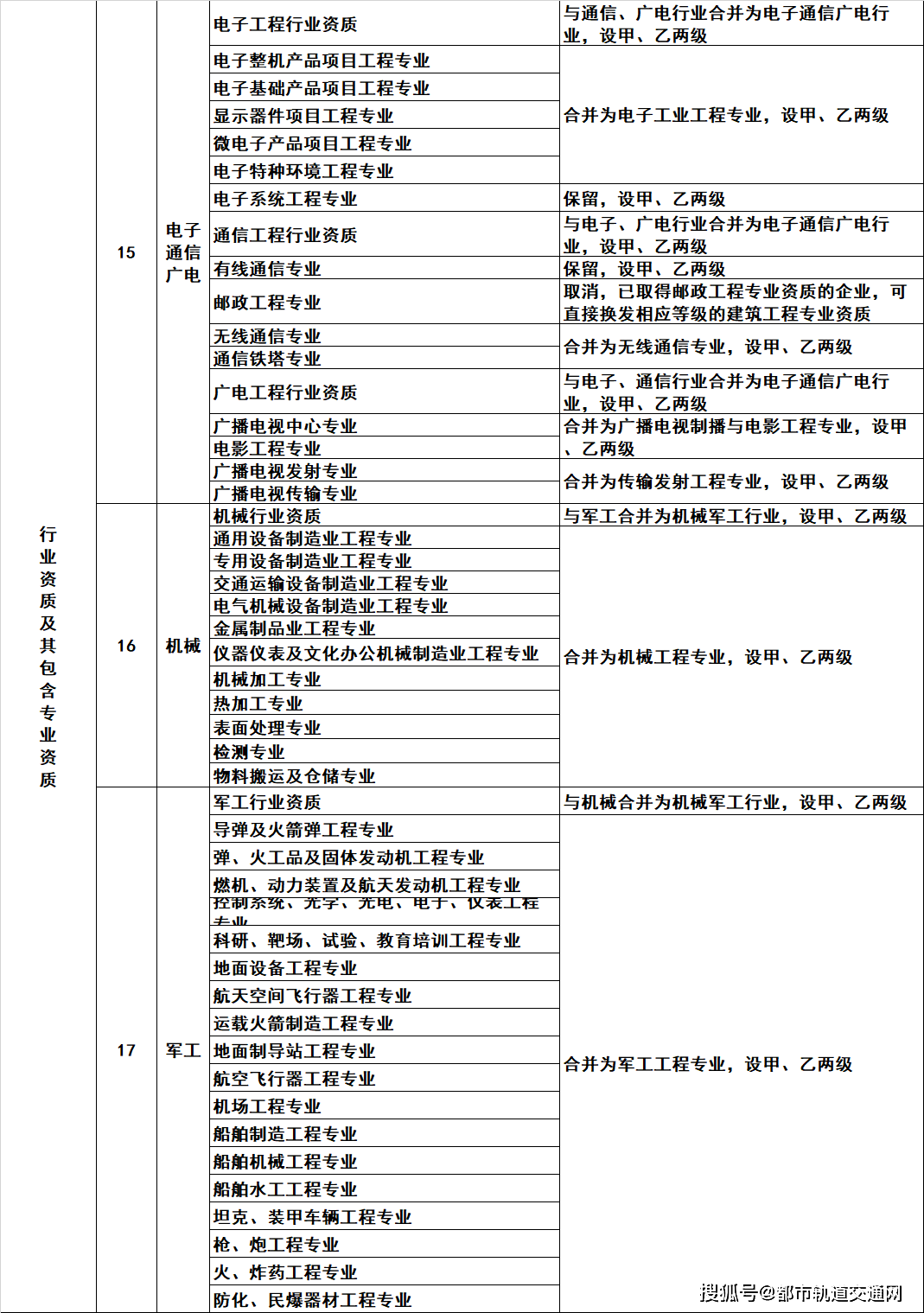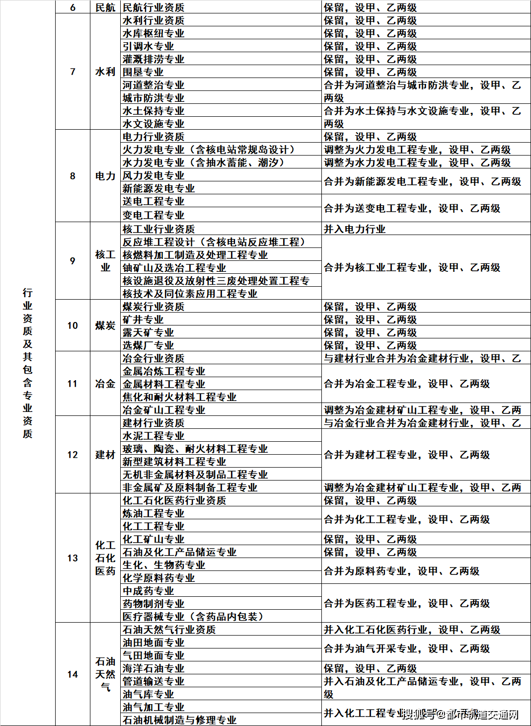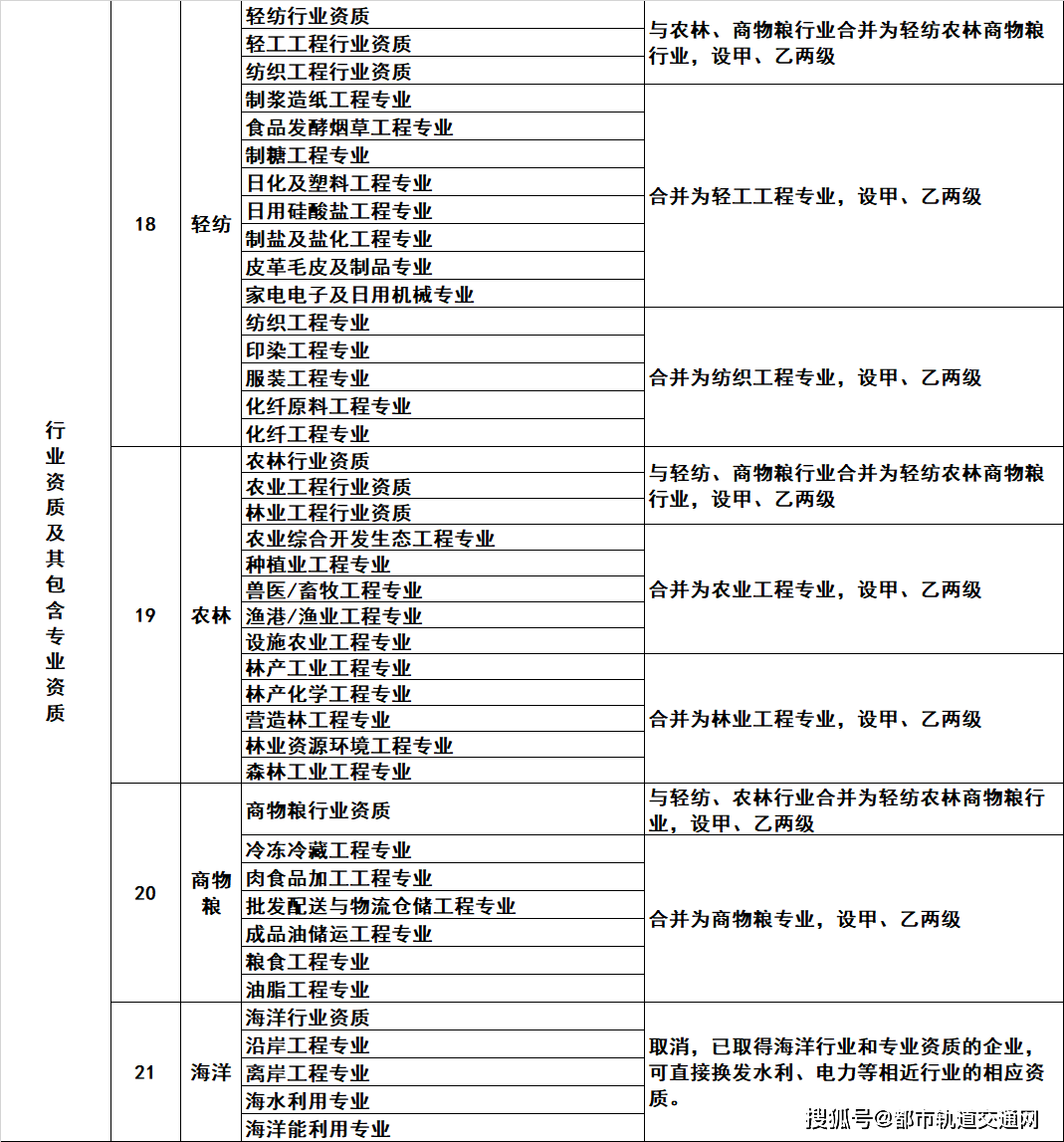 2.工程设计资质。保留综合资质;将21类行业资质整合为14类行业资质;将151类专业资质、8类专项资质、3类事务所资质整合为70类专业和事务所资质。综合资质、事务所资质不分等级;行业资质、专业资质等级原则上压减为甲、乙两级(部分资质只设甲级)。