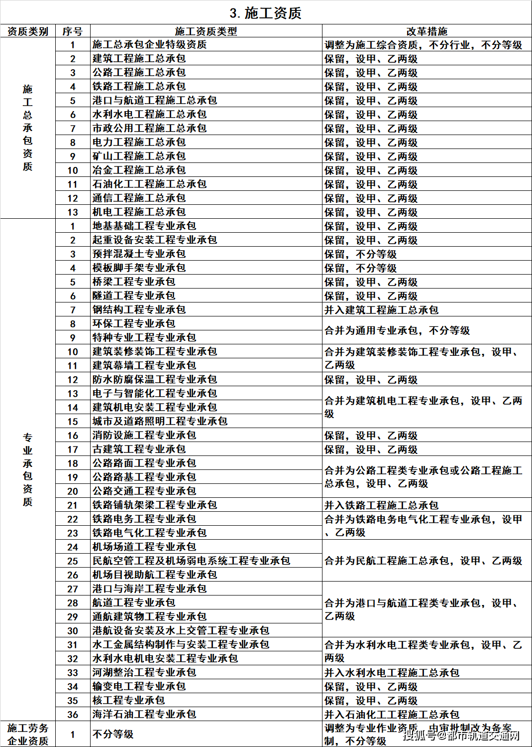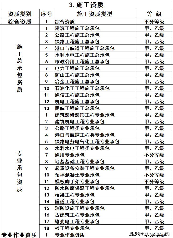 3.施工资质。将10类施工总承包企业特级资质调整为施工综合资质,可承担各行业、各等级施工总承包业务;保留12类施工总承包资质,将民航工程的专业承包资质整合为施工总承包资质;将36类专业承包资质整合为18类;将施工劳务企业资质改为专业作业资质,由审批制改为备案制。综合资质和专业作业资质不分等级;施工总承包资质、专业承包资质等级原则上压减为甲、乙两级(部分专业承包资质不分等级),其中,施工总承包甲级资质在本行业内承揽业务规模不受限制。