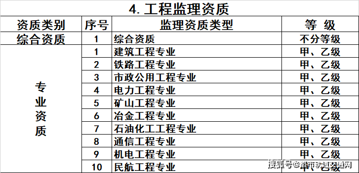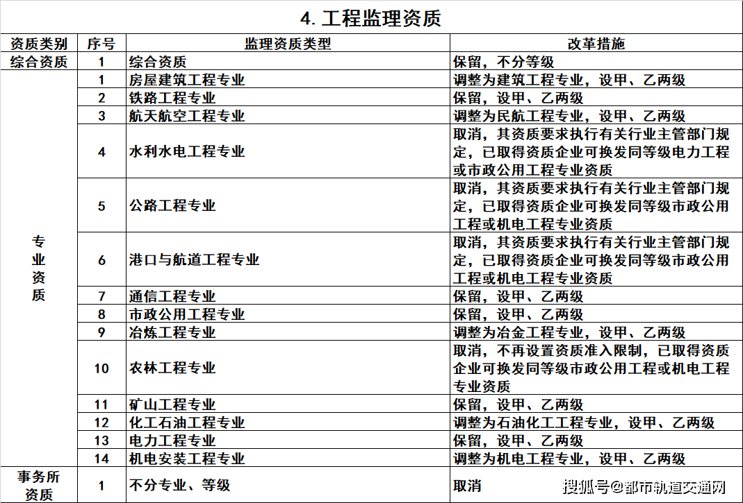 4.工程监理资质。保留综合资质;取消专业资质中的水利水电工程、公路工程、港口与航道工程、农林工程资质,保留其余10类专业资质;取消事务所资质。综合资质不分等级,专业资质等级压减为甲、乙两级。