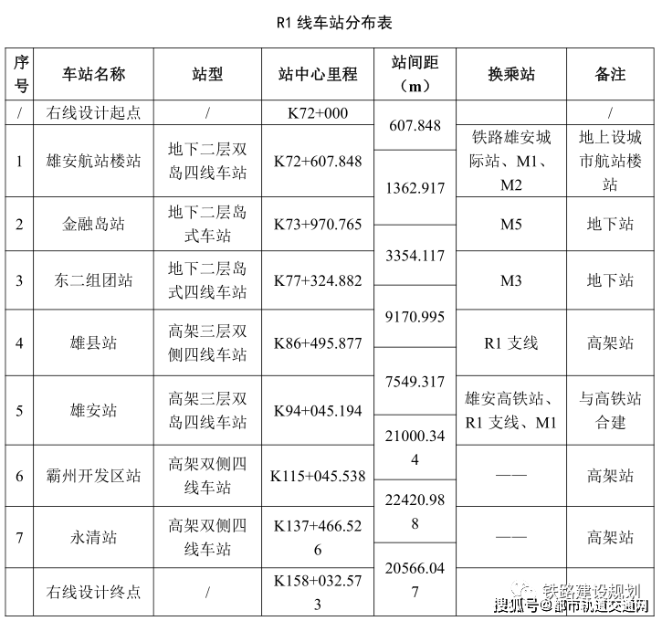 R1线路全长约86公里,其中高架段约65.68公里,其余为地下段。线路设站7座,分别为雄安航站楼站、金融岛站、东二组团站、雄县站、雄安站、霸州经济开发区站、永清站,在大兴机场与北京地铁实现对接。
