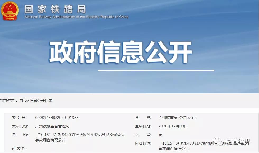 2020年10月15日,广东省湛江市境内,中国铁路南宁局集团有限公司(以下简称“南宁局集团公司”)管内黎湛线发生了一起货物列车脱轨事故。事故发生后,广州铁路监督管理局组织成立由广州铁路监督管理局、···