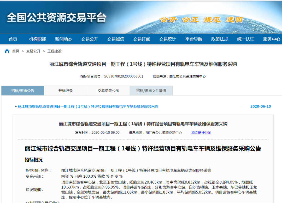 丽江城市综合轨道交通项目一期工程(1号线)特许经营项目有轨电车车辆及维保服务采购公告正式发布。