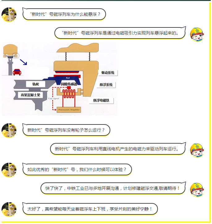 高铁已经这么好 为何还要研制磁浮列车? 除了经济发展速度决定需求,不同交通工具有不同的适用范围,中速磁浮列车主要用于解决当前城市轨道交通出行难问题,特别是城市低密度人口区域和城市中心区与近郊区交通连接线,市域铁路、同城一体化公交出行等。此外,磁浮列车还能分流地铁、铁路客流,缓解现有资源紧缺、环境和噪声污染方面的问题。 相比于现有的交通工具 磁浮列车有哪些优点? 1.适应能力强:列车具有爬坡能力强、转弯半径小等特点,线路适应性好,选线灵活,可更好的与城市道路结合,避绕建筑物及敏感区。 2.安全性能高:列车采用“抱轨”运行,车辆将轨道及桥梁环抱,避免了脱轨的危险。同时,列车采用电制动+液压制动方式,制动能力强,反应时间快,紧急情况采用落滑橇制动,三种制动方式充分保障列车运行的安全性。 3.运行速度高:列车采用特殊的长大直线电机和国内全新“第二代悬浮架”技术,简化了走行机构,能耗更低,解耦能力更强,运行平稳性更好,最高运行速度可达160~200 km/h。 4.噪声振动低:列车与轨道没有机械接触,不会出现轮轨刚性接触产生的噪声和振动,列车运行时噪声低于轮轨车辆,平稳性高于轮轨车辆,安全舒适,绿色环保。 5.工程造价低:列车建设采用高架敷设,桥梁轻便,施工周期短,占地面积小,修建时受地形影响小,能够减少工程量,线路建设周期短,成本仅为地铁建设成本1/3。 6.运维成本低:列车采用直线电机驱动,运行时与轨道没有机械接触,不产生轮对、齿轮箱等磨损,列车运营及检修、线路维护成本低。 7.环境污染小:列车使用电力运行,可实现有害气体零排放,由于没有轮轨磨耗,也不会在运行中产生铁粉或橡胶粉尘,最大限度避免环境污染。 磁浮列车的原理是怎样呢? 磁浮列车是否存在电磁辐射? 经过科学检测,在1~3米范围内的电磁辐射值小于一个电磁炉的辐射,在3~5米范围内的电磁辐射值不到微波炉的一半,在5米外的电磁辐射值比电动剃须刀更低。磁浮列车的电磁辐射连一个微波炉的辐射都没有,因为它的特定结构,实际上它的电磁相互作用决定了它不可能会产生对人有伤害意义的电磁泄漏。这都是经过严格测试和评估的。 这样的磁浮列车我们何时可以乘坐上呢? 目前,中铁磁浮正在研制“新时代号”磁浮列车,样车已进入动态调试阶段尾声,预计年底可实现工程化列车。 中铁工业旗下中铁磁浮科技(成都)有限公司致力于中低速磁浮列车研发制造和技术服务。2017年下半年,“新时代号”磁浮列车开始研制。2018年10月,磁浮样车完成装车,同年完成整车静态调试。2019年,样车进入动态调试阶段。 时速200km“新时代号”磁浮列车成功下线,标志着我国常导吸引型(EMS)磁浮技术取得新突破。 “新时代号”磁浮列车利用常导电磁铁产生电磁吸力使车辆悬浮,依靠车载直线电机实现驱动运行,具有适应能力强、安全性能高、运行速度高、工程造价低、运维成本低、低碳绿色环保等优势。整车采用车载长大直线电机,低动力作用悬浮架以及模块轻量化等技术,突破了制约EMS式磁浮列车发展的瓶颈,将其运行速度提升至200km/h,填补了EMS式磁浮技术的空白。 该车拥有的核心技术: