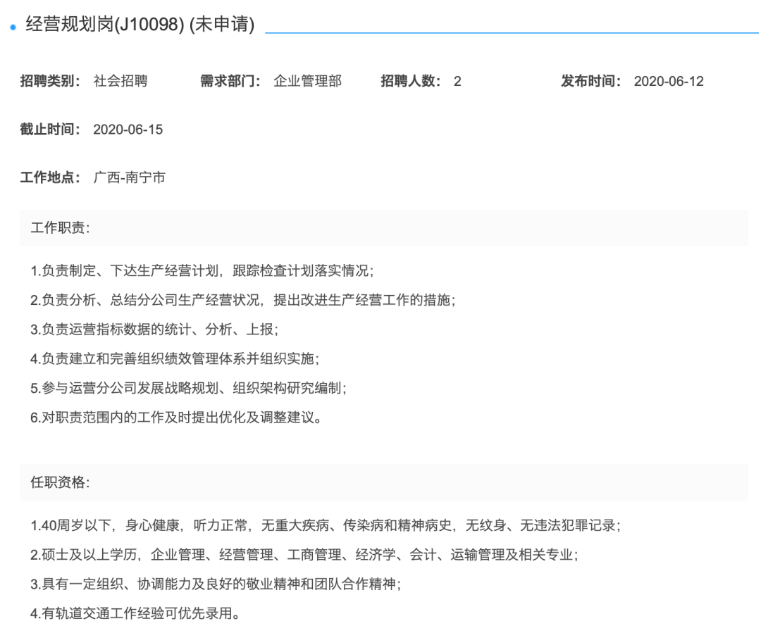 南宁轨道交通集团有限责任公司运营分公司招聘公告