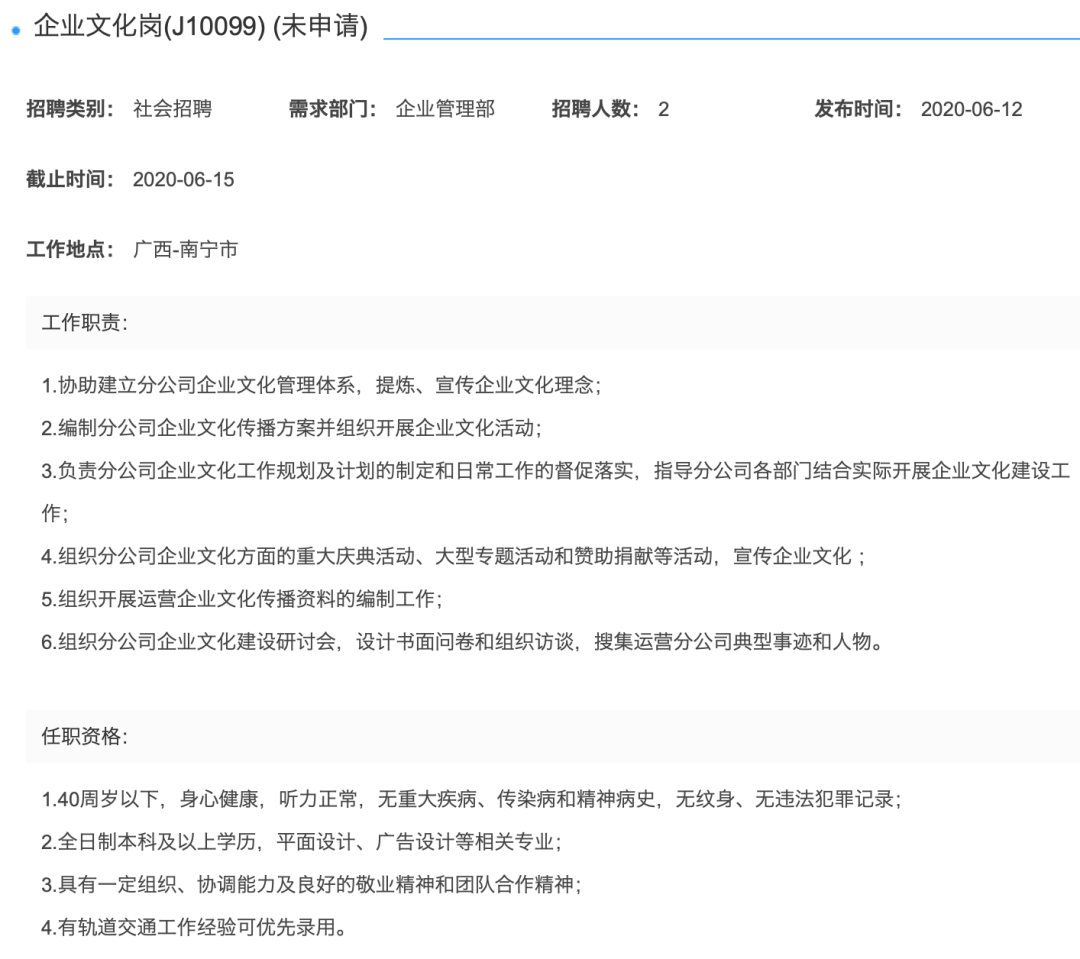 5.公司招聘信息只通过南宁轨道交通集团有限责任公司官网、广西人才网、一览铁路英才网及“南宁轨道交通”官方微信公众号发布,未授权其他网站、个人或机构发布任何招聘信息;对于发布虚假招聘信息的个人或机构,我公司保留追究法律责任的权利;对应聘者因虚假招聘信息造成的损失,我公司不承担任何责任。