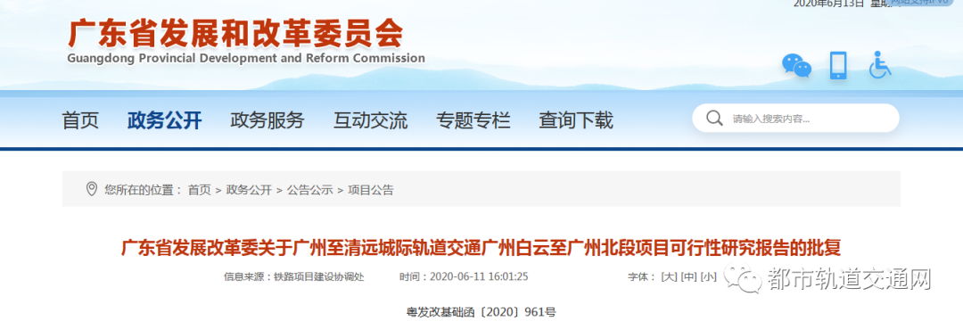 广东省发展改革委关于广州至清远城际轨道交通广州白云至广州北段项目可行性研究报告的批复