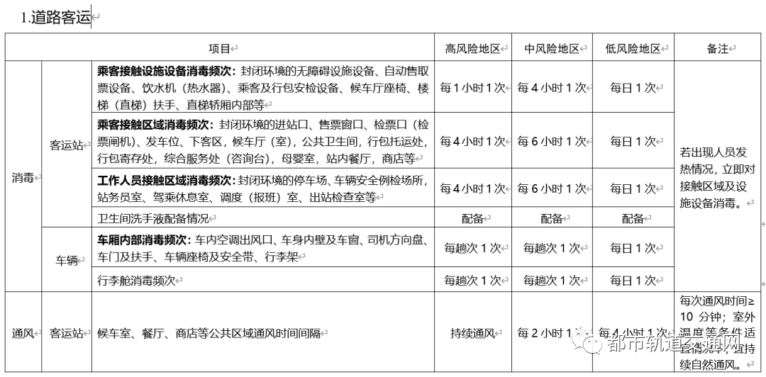 城市轨道交通也明确了拥挤度要求,其中高风险地区车站和列车的拥挤度和满载率应≤50%,车厢内部消毒频次为4小时/次;中风险地区车站和列车的拥挤度和满载率应≤70%, 车厢内部消毒频次为6小时/次。