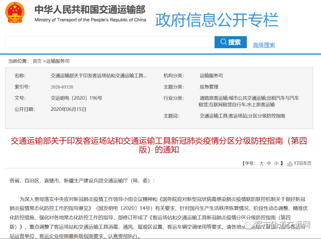 6月15日,交通运输部印发第四版《客运场站和交通运输工具新冠肺炎疫情分区分级防控指南》,明确了道路客运、城市公共汽电车、城市轨道交通、出租汽车、水路客运、互联网租赁自行车等5类交通运输工具及场所相关防疫措施。