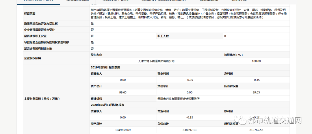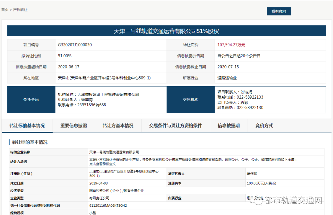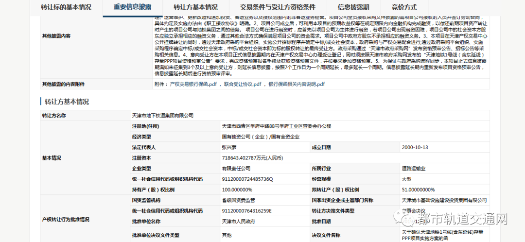导读:天津一号线轨道交通运营有限公司51%股权转让