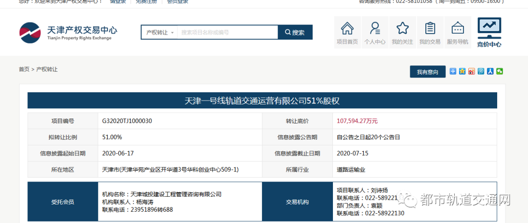 据天交所消息,拟出让天津一号线轨道交通运营有限公司51%股权,转让底价10.75亿元。信息披露日期为2020年6月17日,截至日期为2020年7月15日。