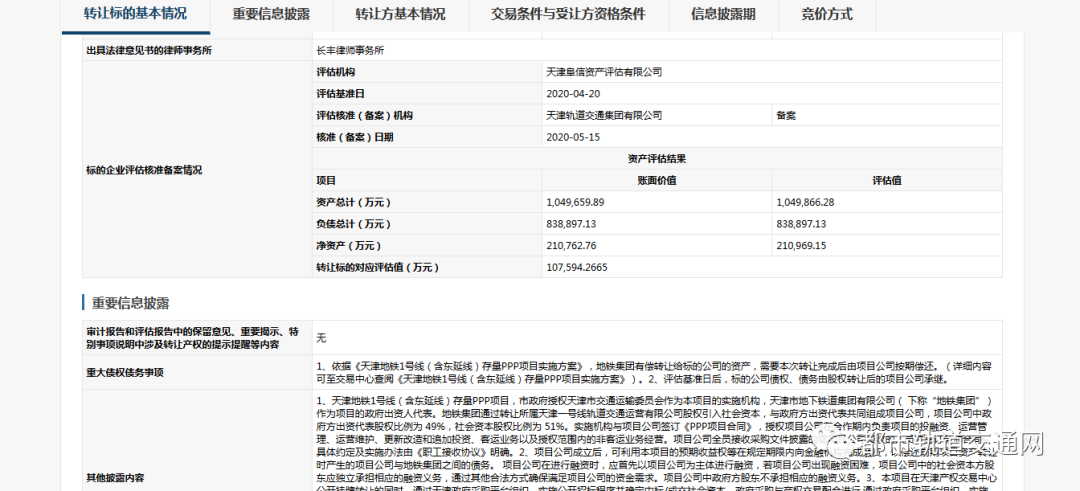 出让文件显示,项目资产总计1,049,659万元,负债总计838,897万元,转让标的对应评估价值107,594万元。项目公司即天津一号线运营公司由天津市地铁集团100%持股。2019年度为净亏损0.35万元。