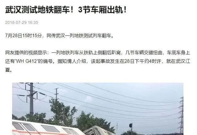 在2018年7月28日,武汉地铁的一列调试列车,有3节车厢出轨。据了解,当时是一列未交付的列车,在厂区测试牵引和制动系统时发生了侧翻,事故造成3人受伤。