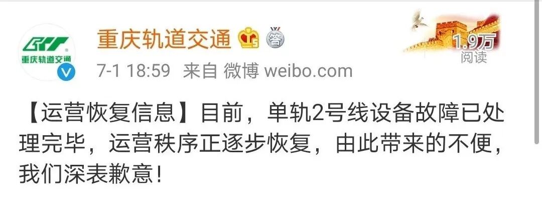 2020年7月1日晚18:59,重庆轨道交通官方微博发布消息【运营恢复信息】目前,单轨2号线设备故障已处理完毕,运营秩序正逐步恢复,由此带来的不便,我们深表歉意!