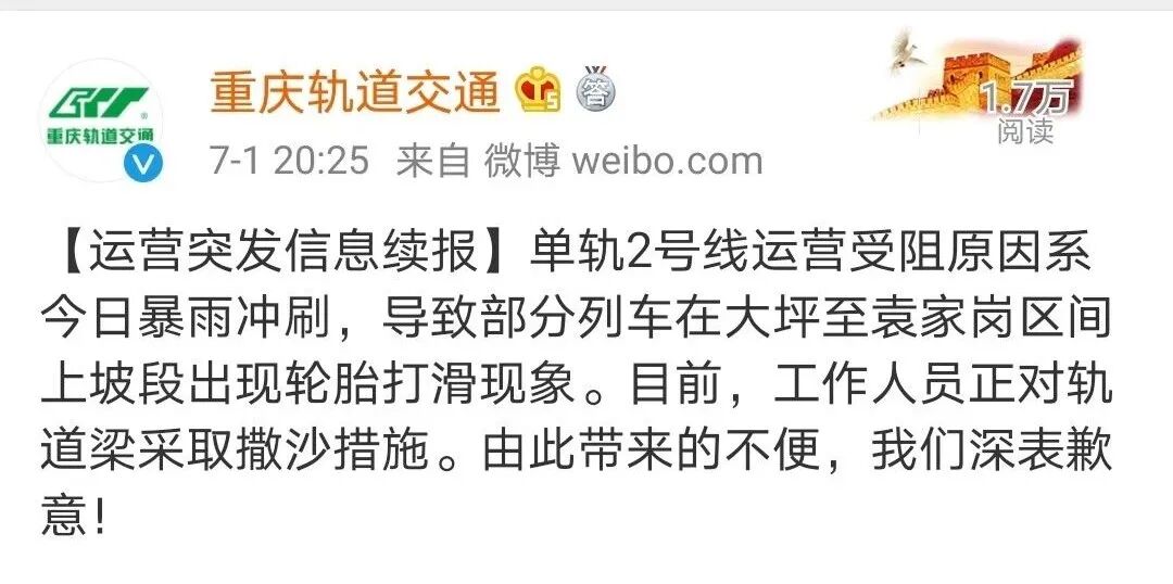 2020年7月1日晚20:25,重庆轨道交通官方微博发布消息【运营突发信息续报】单轨2号线运营受阻原因系今日暴雨冲刷,导致部分列车在大坪至袁家岗区间上坡段出现轮胎打滑现象。目前,工作人员正对轨道梁采取撒沙措施。由此带来的不便,我们深表歉意!