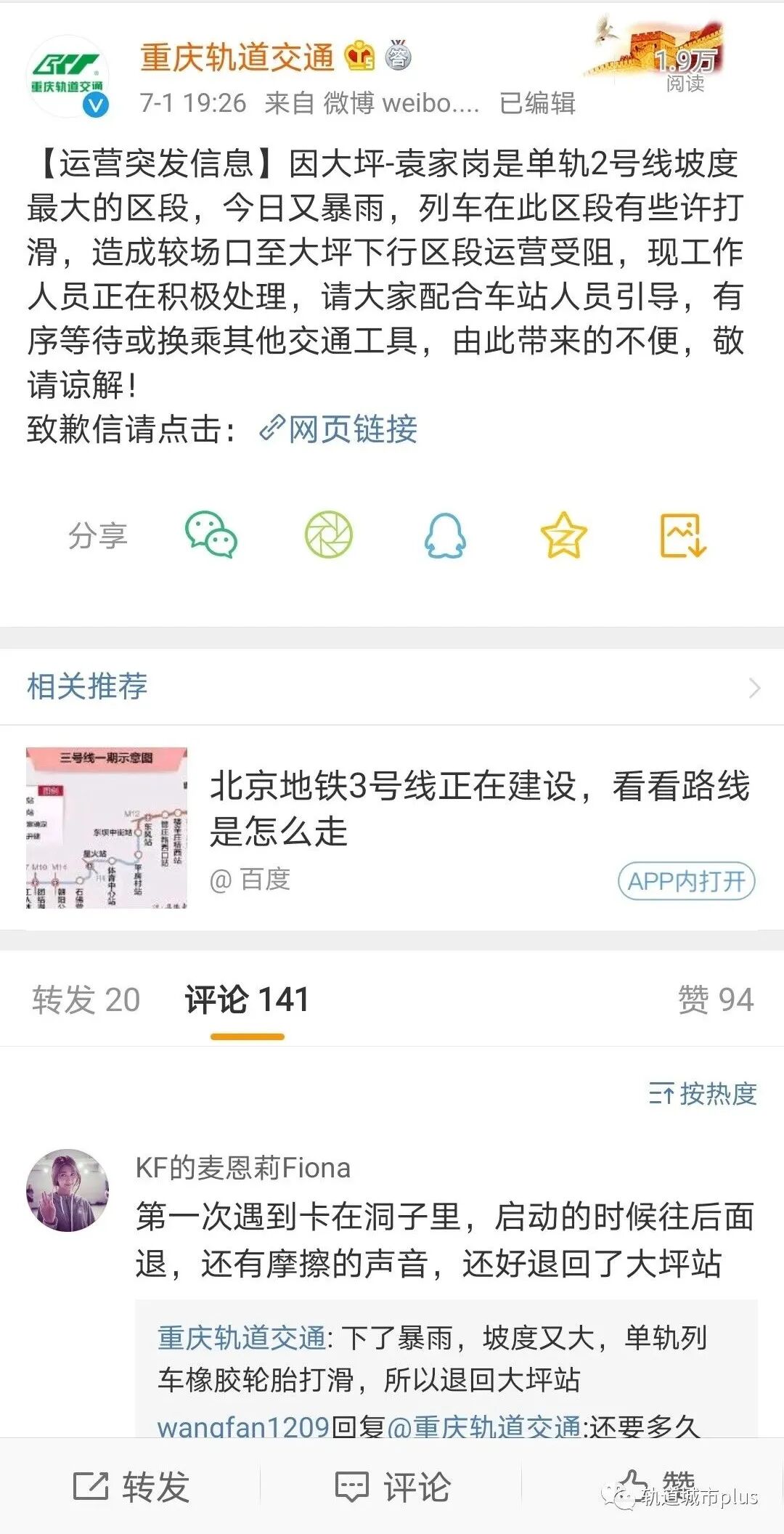 2020年7月1日晚19:26,重庆轨道交通官方微博发布消息
