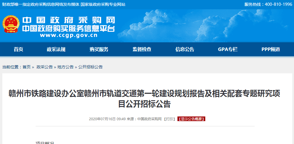 赣州市轨道交通第一轮建设规划报告及相关配套专题研究项目 招标项目的潜在投标人应在 江西省公共资源交易网(网址:http://www.jxsggzy.cn/web/) 获取招标文件,并于 2020年08月07日 09点30分 (北京时间)前递交投标文件。