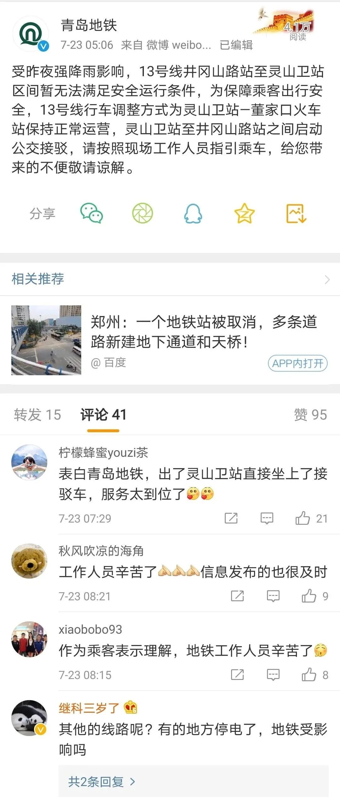 青岛地铁官方微博2020年7月23日早5:06发布消息