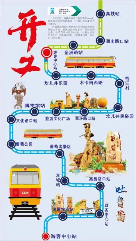 -01- ■ 开工建设 ■ 有轨电车线路图 -02- ■ 项目概况 ■ 据吐鲁番西游轨道交通有限公司董事长胡生旺介绍,吐鲁番旅游现代有轨电车项目为旅游观光主干线,服务城区周边景点、兼顾居民交通。该项目共建设3条线路,一期总投资18.7亿元,规划建设1号、3号两条线路,全长26.8公里,设18座车站,其中换乘站2座。 吐鲁番旅游现代有轨电车运行效果图 -03- ■ 项目意义 ■ 吐鲁番旅游现代有轨电车建成后,在与其他交通工具有效配合下,将促进各景区的协同发展,实现高铁站、机场、汽车站与市区及旅游景点之间顺畅接驳。此外,该项目不仅将串联交河、坎儿井、苏公塔、葡萄沟、火焰山等15个景区景点,形成“环游吐鲁番、全域深度游”的新环线,补齐游客旅游出行短板,有效提高区域旅游服务品质,提升旅游体验。还将深度融合旅游文化资源,形成景城一体、产城一体发展的新格局,打通全域旅游产业瓶颈,无缝链接“吃住行游购娱”全要素、全产业,使旅游围绕轨道交通转起来,城市围绕全域旅游兴起来。 -04- ■ 项目投资 ■