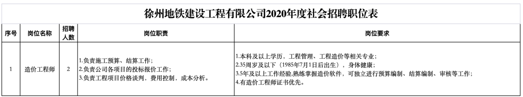 徐州地铁建设工程有限公司是徐州市城市轨道交通有限责任公司的控股子公司,成立于2020年6月,资质类别及等级为建筑工程施工总承包壹级,主要负责徐州市城市轨道相关项目建设业务。现根据公司发展需要,诚邀有志之士加入,具体招聘事宜如下: