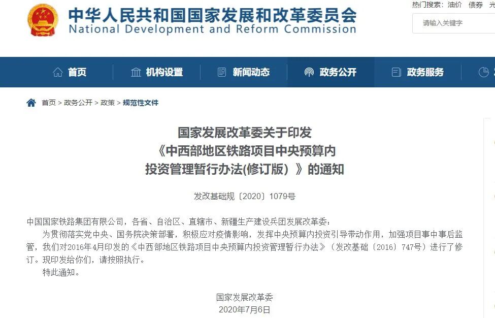 国家发展改革委关于印发《中西部地区铁路项目中央预算内投资管理暂行办法(修订版)》的通知 特此通知。 附件: 《中西部地区铁路项目中央预算内投资管理暂行办法(修订版)》 国家发展改革委 中西部地区铁路项目中央预算内投资管理暂行办法(修订版) 第一章总则 第一条为进一步规范中西部地区铁路项目中央预算内投资管理,发挥中央资金使用效益,推动中西部地区铁路建设,根据《政府投资条例》(国务院令第712号)、《中共中央国务院关于深化投融资体制改革的意见》(中发﹝2016﹞18号)、《国务院关于改革铁路投融资体制加快推进铁路建设的意见》(国发﹝2013﹞33号)、《国家发展改革委关于规范中央预算内投资资金安排方式及项目管理的通知》(发改投资规﹝2020﹞518号)以及有关法律法规,制定本办法。 第二条所有使用中央预算内投资的新建、改扩建铁路项目适用本办法。 第三条对符合本办法规定及相关条件的中西部地区铁路,原则上由国家发展改革委按照资本金注入方式安排中央预算内资,由中国国家铁路集团有限公司作为出资人代表投入项目。 第四条遵循统筹兼顾、突出重点、公开公正、有效监管的原则,规范中央预算内投资安排和使用管理。 第二章支持方向 第五条支持对促进区域经济社会协调发展、带动国土资源开发、增强国防建设,对改善交通条件、增进人民福祉、强化保障能力具有重要意义的中西部地区铁路项目。 第六条支持范围包括中西部地区,以及明确享受中西部地区支持政策的中央苏区、革命老区有关县市、贫困地区。 第七条对藏区、南疆及重点沿边地区的干线铁路项目,加大中央预算内投资支持力度。 第三章资金安排 第八条国家发展改革委已在可研批复时承诺投资并明确投资额度的项目,原则上按照承诺额度上限,结合年度投资计划和工程建设进度,合理安排中央预算内年度投资计划。 第九条国家发展改革委已在可研批复时承诺投资,但未明确投资额度的项目,将结合项目工程进度合理安排中央预算内投资计划。对列入“十四五”规划建设的重大项目,统筹考虑项目总体规模、筹资方案等,另行研究确定中央预算内投资安排标准。 第十条国家发展改革委根据年度中西部铁路中央预算内投资专项规模,结合中国国家铁路集团有限公司提出的年度计划需求,制定资金安排方案,作为年度中西部地区铁路专项投资下达的依据。 第四章投资计划申请 第十一条根据党中央、国务院的重大决策部署,国家发展改革委统一印发编制年度中央预算内投资计划的通知,明确计划编制的主要原则、重点安排方向、工作进度和有关工作要求。 中国国家铁路集团有限公司按照要求编制下一年度中西部地区铁路项目中央预算内投资计划申请,并将申请的资金项目填报录入重大建设项目库。未进入项目库的项目原则上不得申请中央预算内投资。 第十二条申请中央预算内投资的项目需具备以下条件: (一)符合本办法第六、七条确定的领域和方向; (二)符合国家批准的中长期铁路网规划、五年发展规划和相关专项规划; (三)按照有关规定,项目依法合规完成可行性研究报告、初步设计审批、核准或备案,具备开工条件; (四)建设资金来源和建设条件基本落实; (五)符合年度申报要求的其他条件。 第十三条中国国家铁路集团有限公司应对中西部铁路中央预算内投资专项申请是否符合政策要求、项目审批(核准、备案)是否符合有关规定、建设资金来源和建设条件是否落实等进行严格审查,对审查结果和申报材料的真实性、合规性负责,并提出推进项目实施的保障和监管措施。 第五章审核下达 第十四条国家发展改革委受理中央预算投资计划申请后,重点对以下事项进行审核: (一)是否符合中西部地区铁路中央预算内投资专项的使用方向; (二)是否符合中央预算内投资的安排原则; (三)项目的资金来源和主要建设条件是否基本落实。 第十五条国家发展改革委对报送的中央预算投资计划申请报告进行审核,一次或分次下达年度投资计划。在执行过程中,确需调整投资计划的,由原申请单位提出调整申请,国家发展改革委结合项目实施情况按规定进行调整,安排用于可形成有效支出的项目。 第六章监管措施 第十六条中国国家铁路集团有限公司按照职责分工严格监管,加强项目实施过程的跟踪检查,发现问题及时整改和作出处理,按月于每月10日前将项目的开工情况、投资完成情况、工程形象进度等数据通过重大建设项目库报送国家发展改革委。国家发展改革委适时对计划执行情况进行抽查,重点检查项目管理、资金使用、施工进度、工程质量等。防止转移、侵占或者挪用,保证中央投资的合理使用和项目建设实施。 第十七条不涉及保密要求的投资项目,应当按照有关规定向社会公开,主动接受公众监督,对公众反映的情况,国家发展改革委、中国国家铁路集团有限公司应及时开展检查,确有问题的,要督促项目单位及时整改。 第十八条国家发展改革委接受单位、个人对项目审批、资金安排、建设过程中的违法违规行为的举报,按照有关规定办理。 第十九条国家发展改革委应按照有关规定对中央预算内投资的项目进行督导,对发现的问题按照有关规定及时作出处理。 第二十条项目出现下列情形之一,国家发展改革委责令限期整改,采取通报、批评或