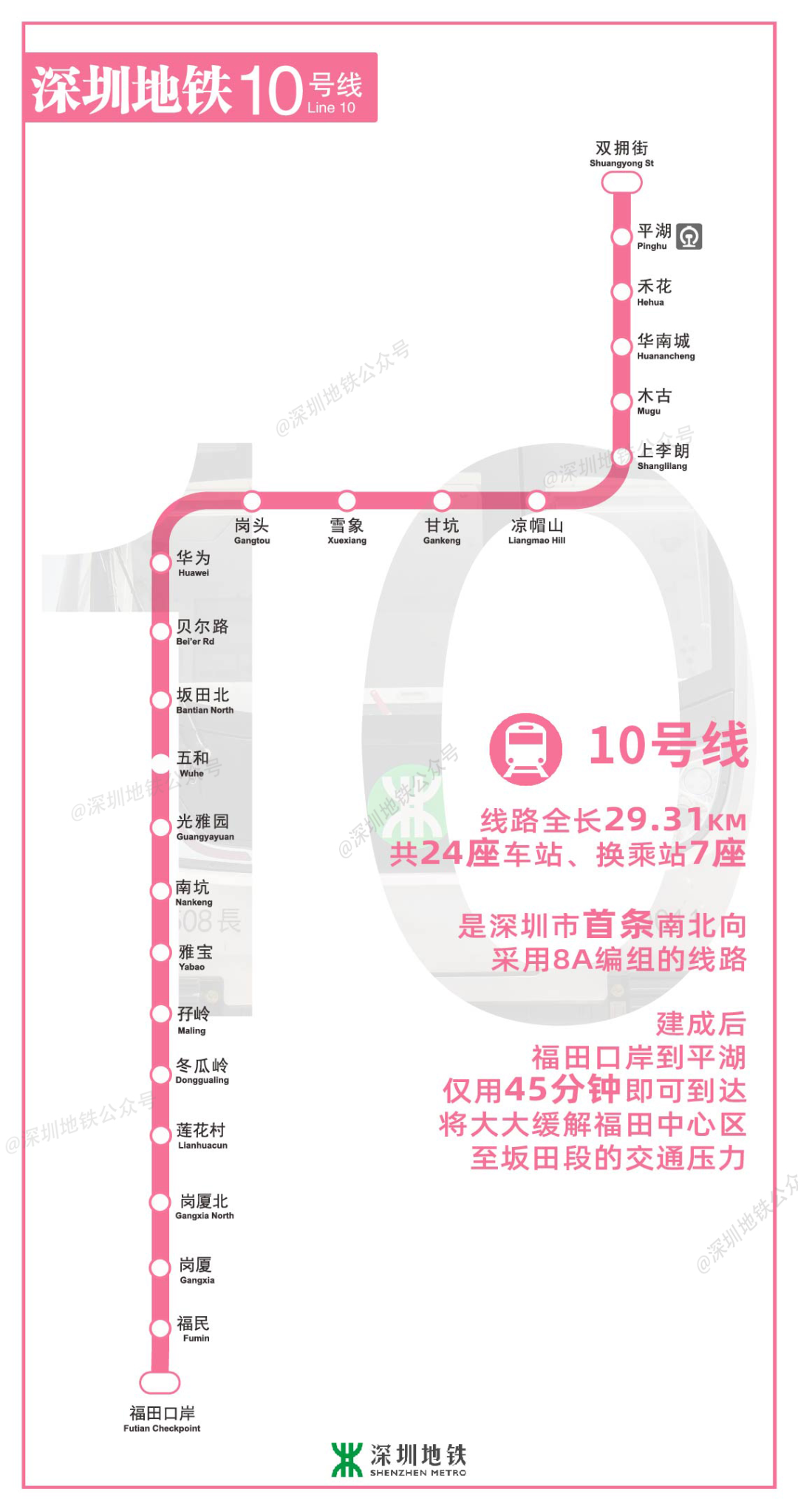 深圳地铁10号线是深圳轨道交通三期二阶段线路之一起于福田口岸站途经福田区、龙华区、龙岗区止于双拥街站线路全长29.31公里共设24座车站全部为地下车站