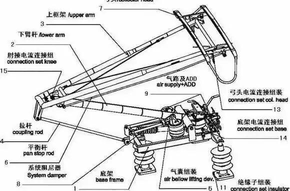 当列车运行时,它就会在气压的作用下升起来从接触网获得直流1500伏电压,其工作原理很简单:从空压机获得气体推动气囊拉起下臂杆,其实就是四连杆机构。