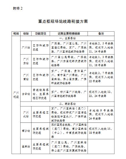 按照城际铁路引入中心城区、干线铁路便捷衔接的思路,结合重点枢纽相关主辅枢纽场站的功能定位和能力,确定重点枢纽场站线路衔接方案(见附件2)。其中,珠海鹤洲站、肇庆东站衔接近期实施的珠海至肇庆高铁,珠三角机场站衔接近期实施的南宁至玉林铁路至广湛铁路连接线。
