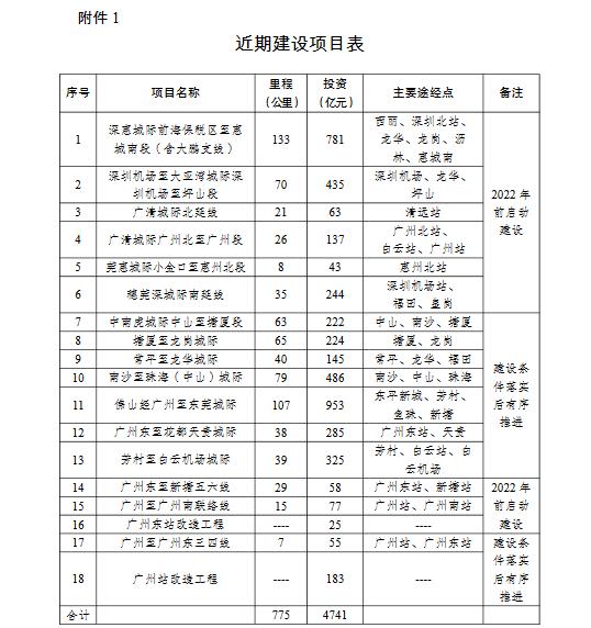 规划建设13个城际铁路和5个枢纽工程项目,总里程约775公里(见附件1),形成主轴强化、区域覆盖、枢纽衔接的城际铁路网络。其中,2022年前启动深圳机场至大亚湾城际深圳机场至坪山段、广清城际北延线等6个城际铁路项目和广州东站改造工程等3个枢纽工程建设,规划建设里程337公里;待相关建设条件落实后,有序推进塘厦至龙岗、常平至龙华等7个城际铁路项目和广州站改造工程等2个枢纽工程实施,规划建设里程438公里。