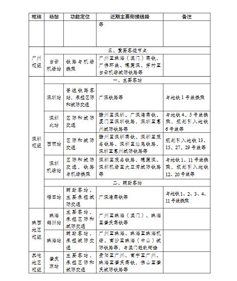 构建粤港澳大湾区内层次分明、分工合理、衔接高效的铁路客运枢纽体系,促进对外交通、城际交通和城市交通便捷衔接换乘。广州枢纽布局以广州、广州东、广州南、佛山西、广州白云(棠溪)站为主,广州北、南沙、新塘站为辅的“五主三辅”枢纽。深圳枢纽布局以深圳北、西丽、深圳站为主,深圳东、福田、深圳机场、深圳坪山站为辅的“三主四辅”枢纽。珠西地区布局以江门、珠海鹤洲、中山北站为主,珠海、中山、蓬江、横琴站为辅的“三主四辅”枢纽。此外,规划布局鱼珠、东莞西、惠州、肇庆东、珠三角新机场站等枢纽场站。