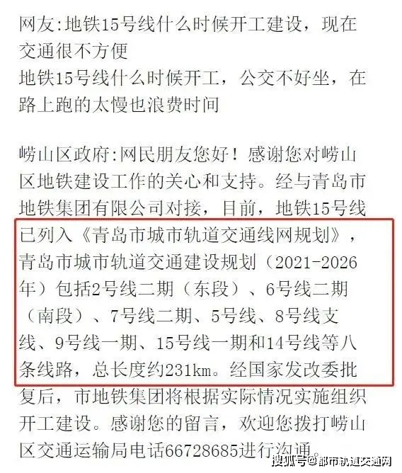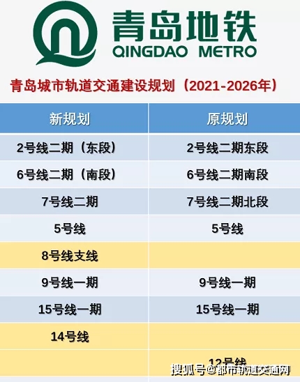 青岛市城市轨道交通建设规划(2021-2026年),具体包括2号线二期(东段)、6号线二期(南段)、7号线二期、5号线、8号线支线、9号线一期、15号线一期和14号线等八条线路,总长度约231km。经国家发改委批复后,市地铁集团将根据实际情况实施组织开工建设。