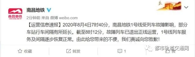 随后,南昌轨道交通集团有限公司发布公告称,2020年8月4日7时40分,南昌地铁1号线受列车故障影响,部分车站行车间隔有所延长。截至8时12分,故障列车已退出正线运营,1号线列车服务及间隔逐步恢复正常。