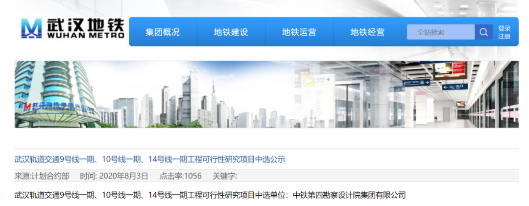 武汉轨道交通9号线一期、10号线一期、14号线一期工程可行性研究项目中选单位:中铁第四勘察设计院集团有限公司