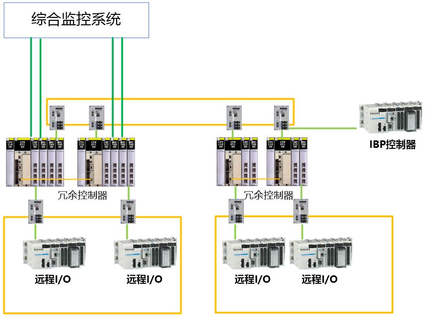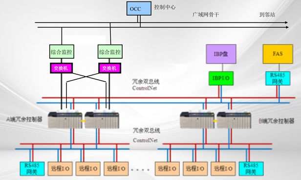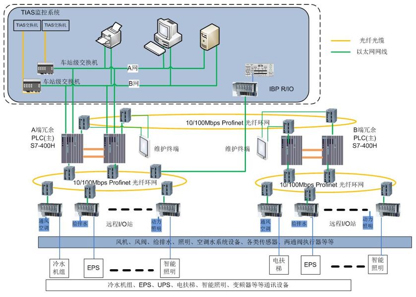 BAS在车站两端的环控电控室分别设置BAS控制柜,柜内配置冗余PLC、I/O组件、通信接口模块等设备,分别对车站两端的机电设备(通风空调、动力照明、给排水、电/扶梯、卷帘门等)进行监控。其中靠近车站控制室的一端(A端)的冗余PLC为主控制器,另一端(B端)的冗余PLC为从控制器。BAS在车站控制室IBP盘(综合监控系统提供)上设置1套远程I/O组件(有时设置非冗余小型PLC),用于实现IBP上各种模式控制命令的下发、显示等功能。主、从控制器与IBP盘远程I/O组件之间直接通过高速冗余现场总线或自愈光纤以太环网连接通信。在主、从控制器下设置双总线或自愈光纤以太环网将各类RI/O统一接入,分别实现对车站两端及所辖区间的机电设备(通风空调、动力照明、给排水、电/扶梯、卷帘门等)进行监控管理。BAS在设备房、公共区、风管等位置设置温湿度、二氧化碳浓度等传感器采集环境参数用以控制相关阀门的开度;在车站及车站所辖区间的环控机房、照明配电室、各类水泵、电/扶梯附近等位置设置远程I/O模块箱,通过RI/O模块实现对通风空调、动力照明、给排水、电/扶梯、各类传感器等设备的监控。远程I/O模块箱通过冗余现场总线或自愈光纤以太环网接入主、从控制器。主控制器(A端冗余PLC)通过4个以太网卡与车站级综合监控系统交换机连接,实现与综合监控系统的数据交换,要求车站的BAS和综合监控系统之间与BAS内部的数据流在逻辑和物理上分开考虑。车站BAS的维修信息由综合监控系统集成,综合监控系统在停车场/车辆段设置全线总维修管理工作站。车站控制室IBP盘的布设由综合监控系统统一设置。部分换乘车站需考虑两线通过中央级监控系统的接口传递相关信息,实现换乘站线路正常、阻塞、火灾情况下的信息互通,保证换乘站及相邻区间不同线路机电设备能统一协调工作。场段BAS系统由冗余BAS控制器、远程I/O模块、现场总线或自愈光纤以太环网等组成。其主要功能是监控场段内水泵、室外照明、EPS等机电设备的运行。火灾模式下,FAS向BAS下发火灾模式指令,BAS控制器转入火灾工况并启动相关设备。常见的BAS系统PLC品牌有施耐德、西门子及罗克韦尔(AB),下面将简要描述下这三个品牌的PLC构成方案。
