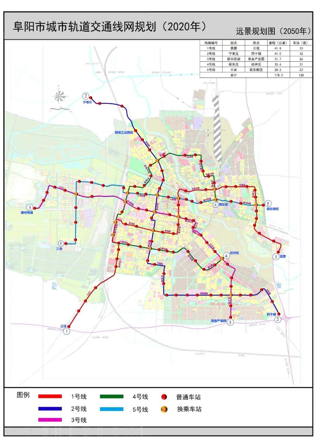 规划远景由5条线路组成,线网总长度178.3公里,总站点数128座,其中换乘站17座。