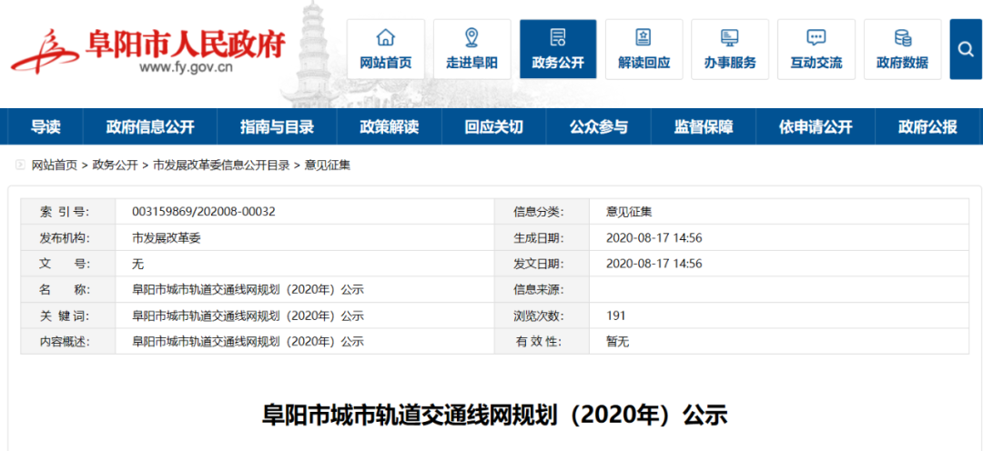 阜阳市城市轨道交通线网规划(2020年)公示