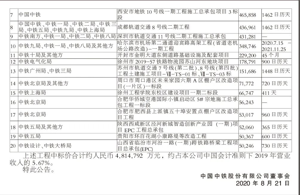 8月21日,中国中铁股份有限公司发布重大工程中标公告,工程中标价合计约人民币481.48亿元。