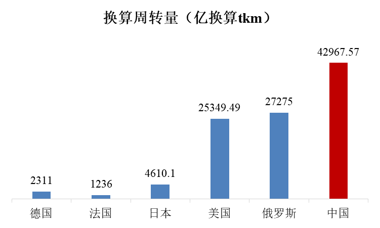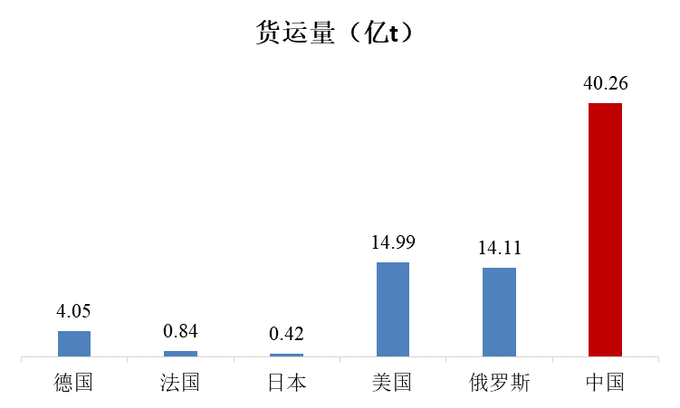 注:日本、法国、德国、中国、俄罗斯为全国铁路2018年数据;美国为I级铁路2018年数据。