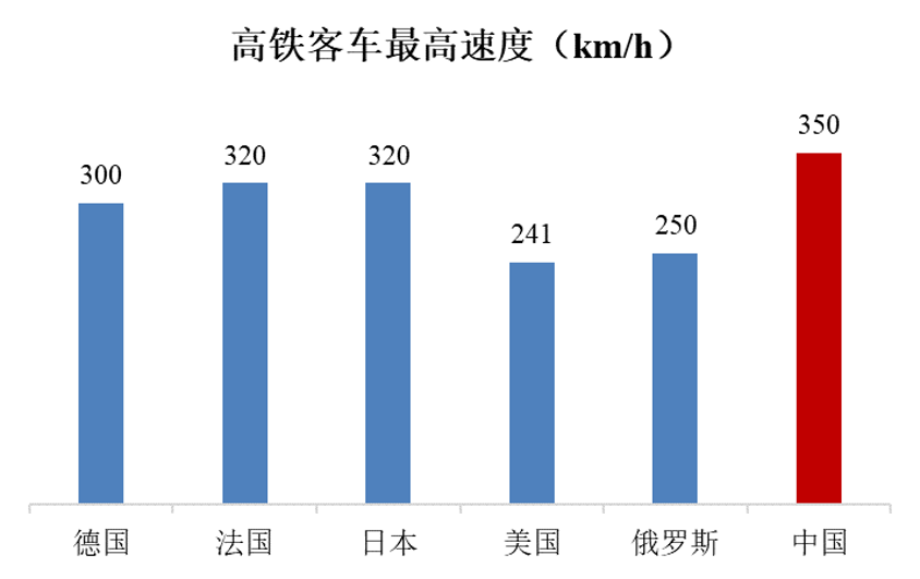 例如,我国高速动车组最高运营速度达到时速350公里/小时,法国和日本均为320公里/小时,德国为300公里/小时,俄罗斯与美国分别为250公里/小时和241公里/小时。