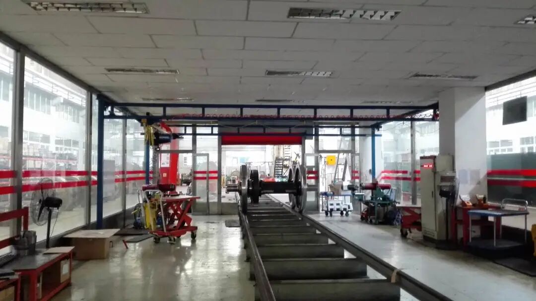 客户为动车检修基地,现场工位跨度7-9m,长度30-120m,主要进行转向架、摇枕、轴向、车轮、电机等的检修和组装。工件多为不规则尺寸,重量为500kg,1000kg,2000kg。待解决的问题主要是现场行车较少,资源有限,经常出现抢用现象;行车定位不准,效率低;行车使用频率太高,故障率较高。